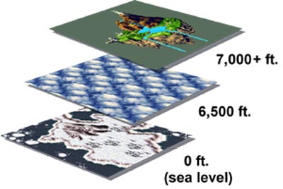 On our Earth we know that plants and animals can only survive in the troposphere - the layer of atmosphere closest to the planet that acts as a blanket. Within this layer there is enough oxygen and warmth for life to thrive. It is also in this layer that we see the formation of clouds and other weather phenomena. It is estimated that at the North and South Poles the troposphere extends to about 30,000 ft. above the Earth's surface, while near the Equator the layer rises much higher, to about 65,000 ft. We do not know exactly where on the planet Zeal was positioned, so for argument's sake let us use the lowest figure for our proof. So we can immediately conclude Zeal was raised no more than 30,000 ft. (about 5.6 miles). Next we have to take into consideration the type of weather that was occurring during the Dark Ages. As the planet was consumed in an ice age we see severe storms batter the surface. Snow, ice, rain... all types of precipitation were present. From this we can conclude the clouds that were in the sky during that era were stratus clouds, as they are the type to produce such fierce weather. More precisely we can say the clouds were nimbostratus, known for their dark grey ominous appearance. Stratus clouds usually form in the atmosphere at altitudes no higher than 6,500 ft. When Crono's team is teleported to Zeal we can look down on the cloud layer and see a thick blanket of clouds, typical of the nimbostratus type. Thus we can conclude that layer of clouds is no more than 6,500 ft. above sea level. Though it is possible for it to have formed much closer to the surface, we will use the maximum height for our calculations. If we were to use the lowest (around 50 ft.) we would find Zeal to hover only a stone's throw above the surface. By looking at Zeal we can determine the islands float even higher than the tops of the cloud cover, as we are able to view them from above. Because it is difficult to judge depth on a television screen we cannot be certain as to how much higher Zeal is than the storm clouds. We might assume there is at least a 500 ft. difference between them, but it may in fact be much be higher. As a result I have concluded the minimal elevation of Zeal must be around 7,000 ft. If you prefer you can add more distance until you come to a figure more to your liking. Though I would suspect Zeal floats no more than 10,000 ft. above the Earth's surface, which is just shy of 2 miles (1.89 mi. actually). So in summary we can conclude the following: