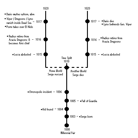 This diagram is rather straightforward and requires little explanation. It details the events of Chrono Cross from the time shortly before Serge's birth until his adventure in 1020 AD. It is uncertain what year Lucca was abducted by Lynx if we look strictly to Chrono Cross for the answer . All we really know for certain is that it occurred after the time split. However the date is supposedly given in the Chrono Cross Ultimania Guide: 1015. It also states that the incident took place in both timelines. For the time being this is the only evidence we have showing what fate befell Lucca in Home World, since the game made no comment on this.
